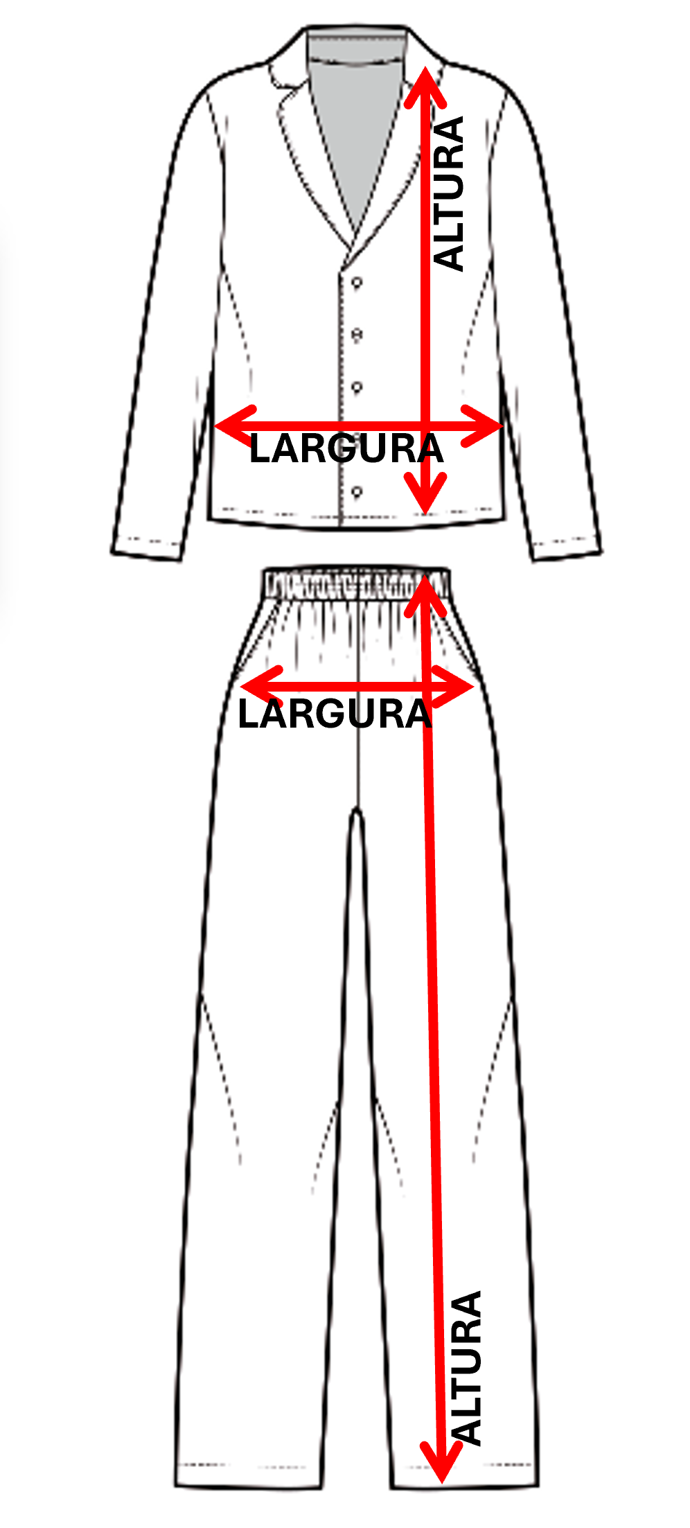 Esse modelo possui camisa com abertura na frente e manga longa e calça com cós com elástico e cadarço.